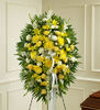 This stunning standing spray boasts a combination of the freshest and most vibrant flowers on the market! It features sultry roses, exquisite lilies, divine spider mums, freshly picked seaonal blooms, and accents of luxurious greenery. Tastefully designed and finished off with a white satin bow. You may upgrade this to include even more flowers or select a personalized ribbon for an extra special touch. We offer free funeral home delivery with this spray.