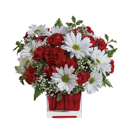 A beautiful red vase filled with daisies and lush greens. One of our best-selling items. The perfect way to send a cheerful message or to let someone know they're in your thoughts. Approximate 8 1/2"W by 8 1/4" H. We offer same-day delivery to anywhere within the greater Toronto area and we also deliver worldwide.