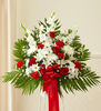 This lovely red and white sympathy basket contains the freshest flowers on the market, including: aromatic roses, exquisite spider mums, delicate glads, freshly picked seasonal blooms, as well as accents of lush greens.